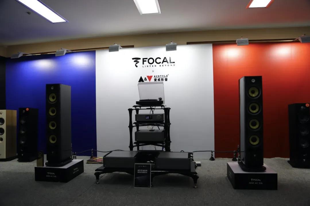 另一展房更是爱威影音今年的重头戏——FOCAL(法国劲浪),首先进去就给这一国旗式布置吸引了眼球。引入眼球的则是Cambridge Audio EDGE M搭配FOCAL ARIA K2 936座地式扬声器。