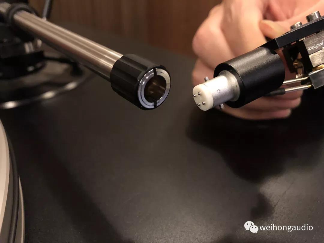 9吋直线唱臂采双管设计,外面的臂管为不锈钢,里面臂管是铝合金,透过不同材料抵消谐振。Einstein这部黑胶唱盘可搭配最长10.5吋的唱臂,虽然12吋臂被视为Hi-End的象征,Volker认为长臂设计弊多于利,所以售价六千多欧元的The Tonearm为9吋设计。唱头座的设计也必较特别,可以很牢固又方便的安装在唱臂上,唱臂线是Einstein订制的铜线。