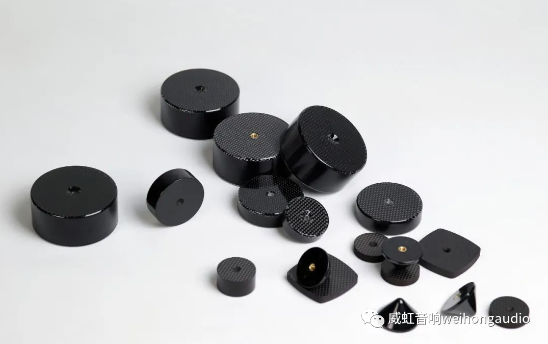 为了规避这些有害的震动,音响厂家也设计生产出各种不同类型的避震器材,而在自然界中,每种物体都有其固有的共震频率,每种材料由于自身密度的不同,它们的固有共震频率也不相同,对各震动频率的传导性能也就不同。所以对避震器材而言,选用制作材料的物理特性是至关重要的。我们现在还能见到一种高科技材料一一碳纤维 ( Carbon Fiber )。在国际上被誉为“黑色黄金”,又被称之为“第三代材料”,具有极高的强度,超轻、耐高温、高压。碳纤维在美国主要发展用于国防与航天等方面,属于高科技产品,产品问世之初对“社会主义国家’”实行封锁。民用方面由于价格昂贵主要用于奢侈品级别的休闲器材方面,如碳纤维自行车等,售价当然不菲,常常是使用普通材料的数倍或数十倍价格。来自美国黑钻石( Black Diamond Racing Sound En 卜 ancement )生产的碳纤维垫材,黑钻石 BDR 是目前全世界运用碳纤维材料研发避震垫材最著名的也是最有公信力的厂家之一。