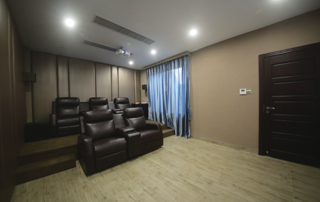 整个设计团队构建这个工程的最终目标不仅仅是带来美轮美奂的效果,更是要声画均匀达到极致的私人影院。这间可以被称的上专业类型的私人影音,包括顶级的音视频设备,室内声学设计,光学设计,自动化设计,电动座椅等等,都成为一个专业影院的设计典范。业主体验影院观影,临场感表现充足,对其赞不绝口。家人体验K歌房,女主人跃跃欲试一口气试了三首歌,对演唱效果非常满意。