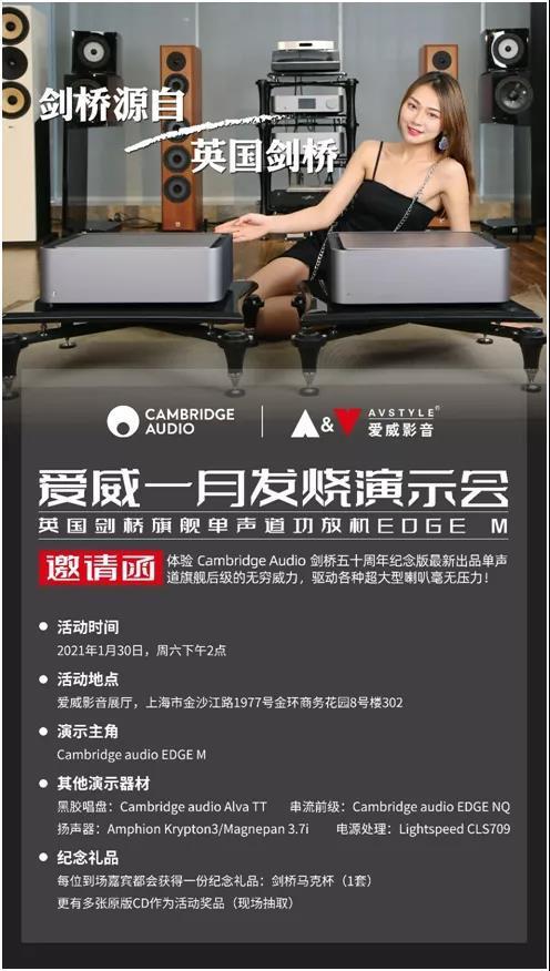2021年1月30日(周六),来爱威影音展厅体验Cambridge Audio英国剑桥50周年最新出品单声道旗舰后级EDGE M的无穷威力,驱动各种超大型喇叭毫无压力!