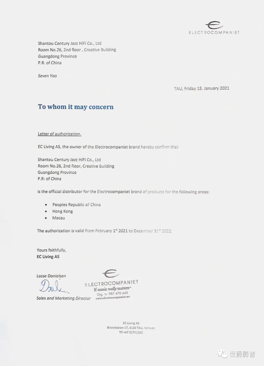Century Jazz 汕头市世爵影音器材有限公司(世爵影音),即日起委任为挪威ELECTROCOMPANIET(音乐之旅)在中国内地及港澳地区的总代理。同时负责ELECTROCOMPANIET一切有关的销售、售后服务的工作。