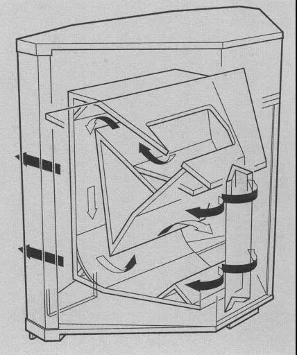 Klipschorn的内部结构,可以看到超大的15英寸低音单元向前发声,通过箱体内复杂的管道扩展,最后借着墙角延伸,达到超宽广的频率响应。