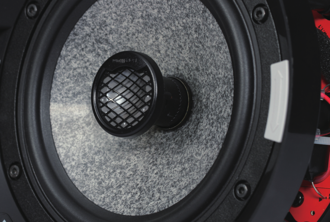 另外,ICW6它不仅适合安装在天花板,也可以安装在墙面上使用。ICW6为2音路2单元设计的嵌入式扬声器,搭载1只6英寸W振膜中低音单元,令音质还原度极高。在低音单元的中央区域还有1只1英寸纯铍反转球顶高音单元,另外还有高音调整功能,都是非常方便的设计。还有带有指向性的一款扬声器ICA6,同样是一款即使安装在天花板上也能够指向用户座位位置的扬声器,是1000系列最新的一个型号,同样采用一只纯铍反转球顶高音单元和一只6英寸W振膜低音单元。新1000系列采用的单元已经足够吸引,就连安装也非常方便,全新1000系列配备了专利的EQI系统(简易快速安装)。安装支架系统可自动将扬声器连接到支架上而无需任何安装工具;安装时先将外圈固定座塞进切割好的圆孔内,然后扳动上面的特殊卡扣固定稳妥,接下来再将扬声器本体推进固定座内,旋转卡住即可。