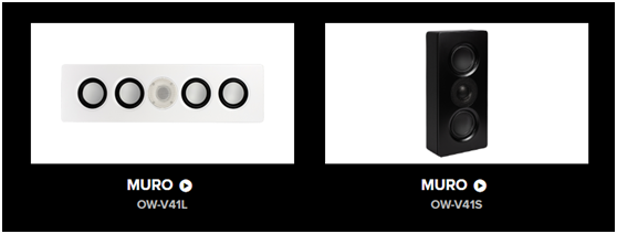 On-Wall(Muro系列)揚聲器則包括OW-V41S-BK/W、OW-V41L-BK/W(如下圖),其中BK為黑色,W為白色。兩者均為「啞鈴式」單元分佈設計,分別為5單元和3單元設計,由軟絲膜高音和鋁振膜單元組成。箱體由CARB2 MDF中密度板打造而成,有黑白兩種顏色選擇。