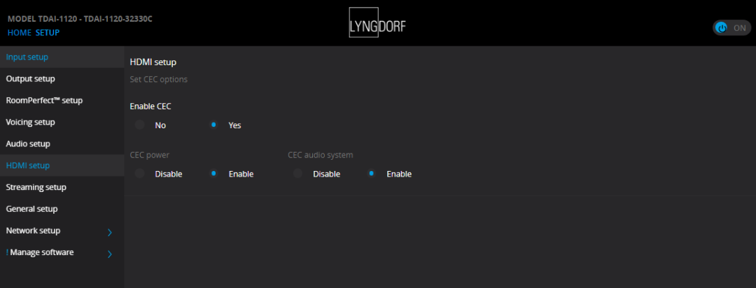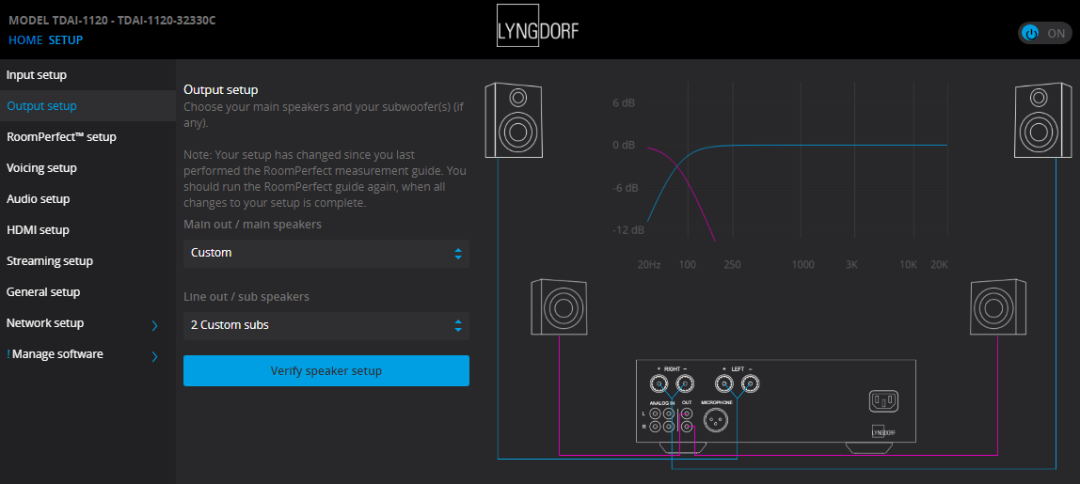 联网后的TDAI-1120,可以通过其IP在浏览器上登录进入,相比TDAI-3400,部分功能略有削减,但是依然具备DSP均衡器、低音炮/左右声道设置、输入设备端的接口设置(例如开启/关闭、名字、灵敏度、EQ选择、延迟和影院模式),包括流媒体的输入端均纳入到当中一并进行管理。而输出设置上,用户可以对设置扬声器和超低音的搭配进行管理,包括电平、滤波、滤波类型、分频点和EQ等。这些进阶的设置适合专业人士的使用。