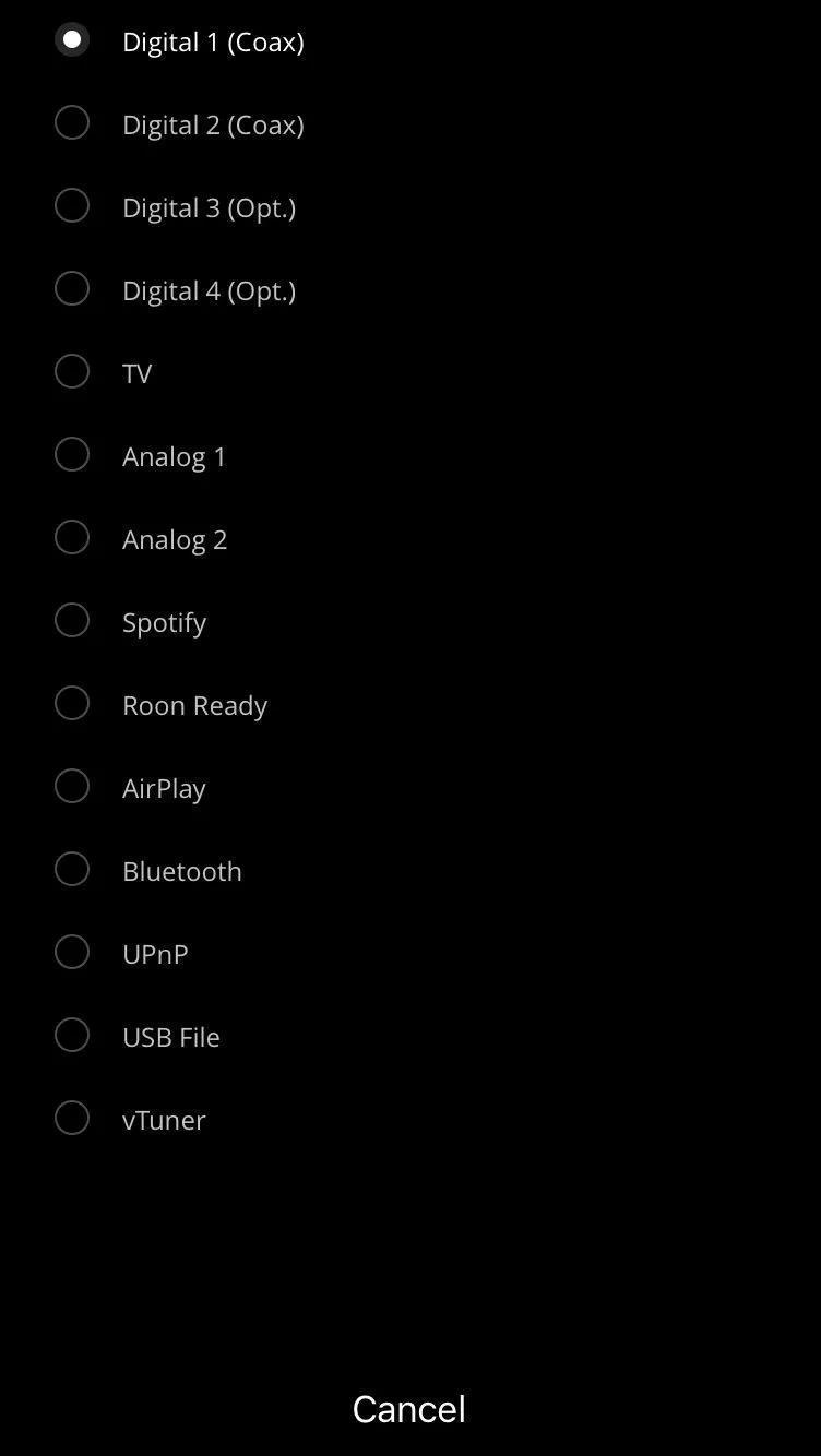 在Top Menu上,你可以看到丰富的讯源接入途径,例如UPnP(局域网中的储存设备)、USB储存设备(背面板USB)、蓝牙、Spotify(内嵌)、vTuner(内嵌)、TIDAL\Qobuz(通过AirPlay或者Chromecast使用相应的App播放)。当然还少不通过Roon桥接播放音乐。