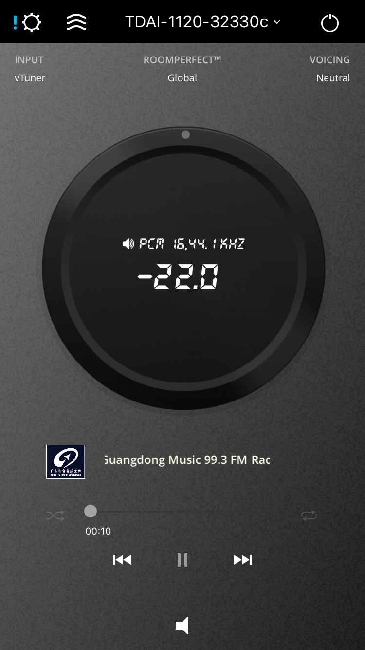vTuner(内嵌)也是很好的功能,例如我直接播放本地电台Music 99.3FM广东音乐之声,这种方式相比通过手机蓝牙传输给TDAI-1120的体验就完全不一样了,一来可以更加稳定,二来解放了所依赖的手机端。