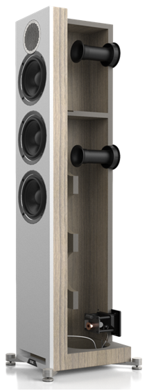 座地式揚聲器DFR52採用了4單元3分頻的低音反射式設計,高音採用1英寸絲膜軟球頂單元(經過改進的新型寬指向波導高音),前方設置一個新開發的蜂巢形波導式網罩,不僅造型美觀,更具備保護高音單元的功能,另一方面還能提升聲音的擴散性,並可加強高頻延伸,達到35kHz的優異水平。中低音單元均採用5.25英寸Aramid Fiber芳綸纖維音盆,並使用全新設計的單元盆架,除了可以把諧振降到最低之外,還能強化前障板的強度,進而減低整體振動。DFR52 對於降低揚聲器共振也不遺餘力,它在頂板與側板均設置了圓周型補強支撐設計,可大幅減輕箱體共振。更特別的是,DFR52倒相孔具備前障板底縫和後方圓形喇叭口兩種方式,可以大大降低氣流進出時的風噪聲,並提高低頻輸出,讓DFR52低頻延伸達到45Hz的優異水平。