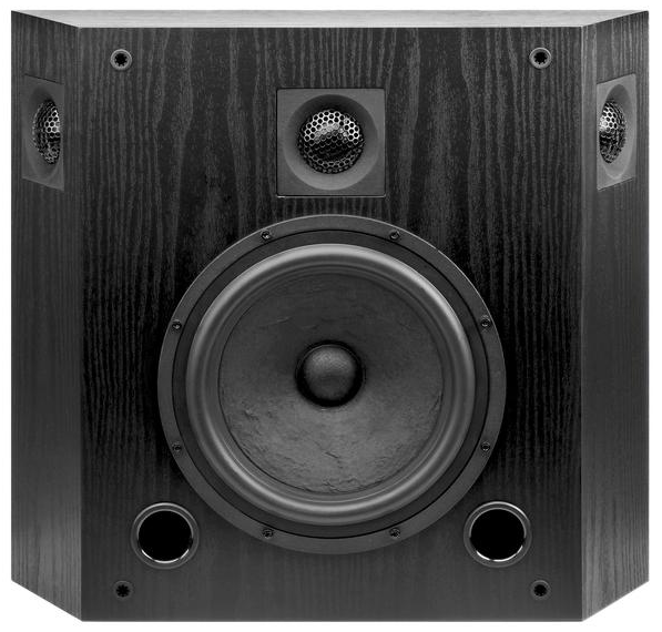关于环绕声,我有一对S8T。这些扬声器是Tripole三面发声设计,使用了8英寸长木纤维低音单元,它们在每个梯形侧面配备了前向发声的1英寸丝膜球顶高音扬声器,频率响应是和S81相同的40-30kHz,阻抗同样为4欧姆,灵敏度等级为90dB。箱体尺寸为14.9“x16.3” x4.9“(HWD),重量为21磅。