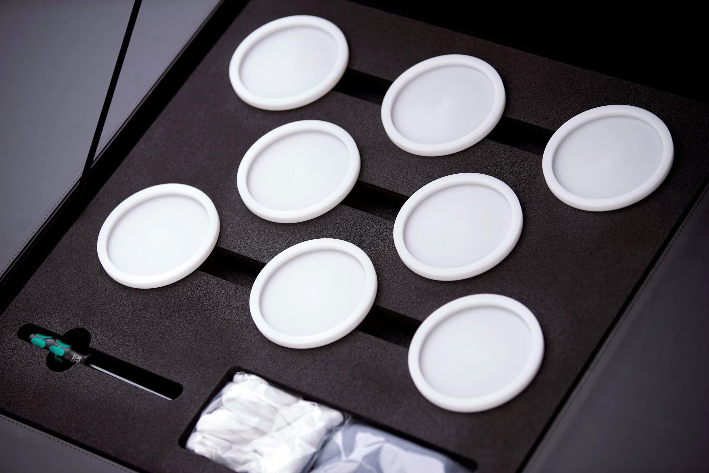 一只非常重的扬声器需要精确地移动到合适的位置,然后同样精确地对它进行调整。幸运的是,Göbel品牌的产品安装指南也涵盖了这些内容。中神曲扬声器采用了四只巨大可调节的不锈钢脚钉。与地板连接的圆形脚钉盘具有33mm细螺距螺纹,每只脚钉盘通过三只大型陶瓷球实现相互隔离。水平孔的设计可以让用户使用一只结实的工具,以可观的精准度调整每只脚钉的高度以及扬声器的姿态。同时,扬声器还附带了一套设计巧妙、由圆顶Delrin材料制成的“拖鞋”移动底座,一旦将其安装在每只脚钉之上,就可以轻松地将扬声器滑动到正确的位置。每只“拖鞋”底座的厚度非常小,这意味着当用户移除这些安装辅助设备后,室内的低频响应仍然会保持未安装“拖鞋”底座时的初始状态,而不会发生改变。这些细节意义重大,表明厂家对产品整体细节有着充分的思考。