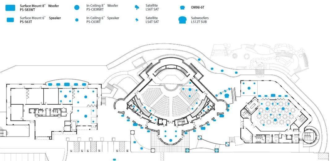 从停车场,到排列在教堂入口的花盆和支撑屋顶的椽子,南海岸教堂的室外安装了:4.5”和6.5”的Landscape系列卫星扬声器;12”和15”的Landscape系列低音炮;两个全指向70V/100V OMNI-6T扬声器,和各种Surface Mount系列的低音炮。该产品所具备的全天候结构可以防止扬声器受潮或是受到其他户外因素的损伤。Sonance所提供的丰富的户外音箱产品和多种安装方式也使得南海岸教堂团队可以用全音域的声音填充不同的景观,同时确保在不同的空间内拥有一致的声调。