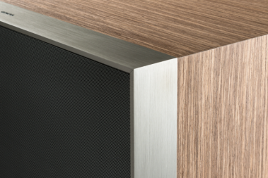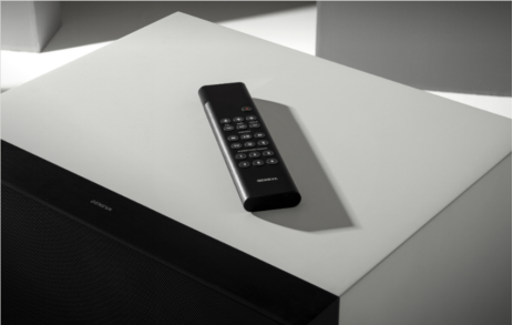 DeCon采用了极简的设计,通过专用的金属脚架让音箱稳稳地竖立在地板上。其尺寸为45×40×78cm,外观采用了三个颜色可供选择,包括铜色铝条搭配黑松木饰面、黑色阳极氧化铝搭配白色漆面以及阳极氧化铝条的胡桃木饰面。从外观上看似一个单声道音箱,其实内有乾坤,Geneva为其配备了一个立体声系统安装在箱体内部,总功率达到了500W,内置了五个驱动单元,在笔者以往评测的同类型音箱中,很少产品配置如此多的单元,而且Geneva保证每一款产品都能实现Hi-Fi立体声系统的声音体验和品质。DeCon外观没有显示器和按钮,让其如同一件古典家具,通过独特设计的遥控器,令一切操作尽在掌握之中。