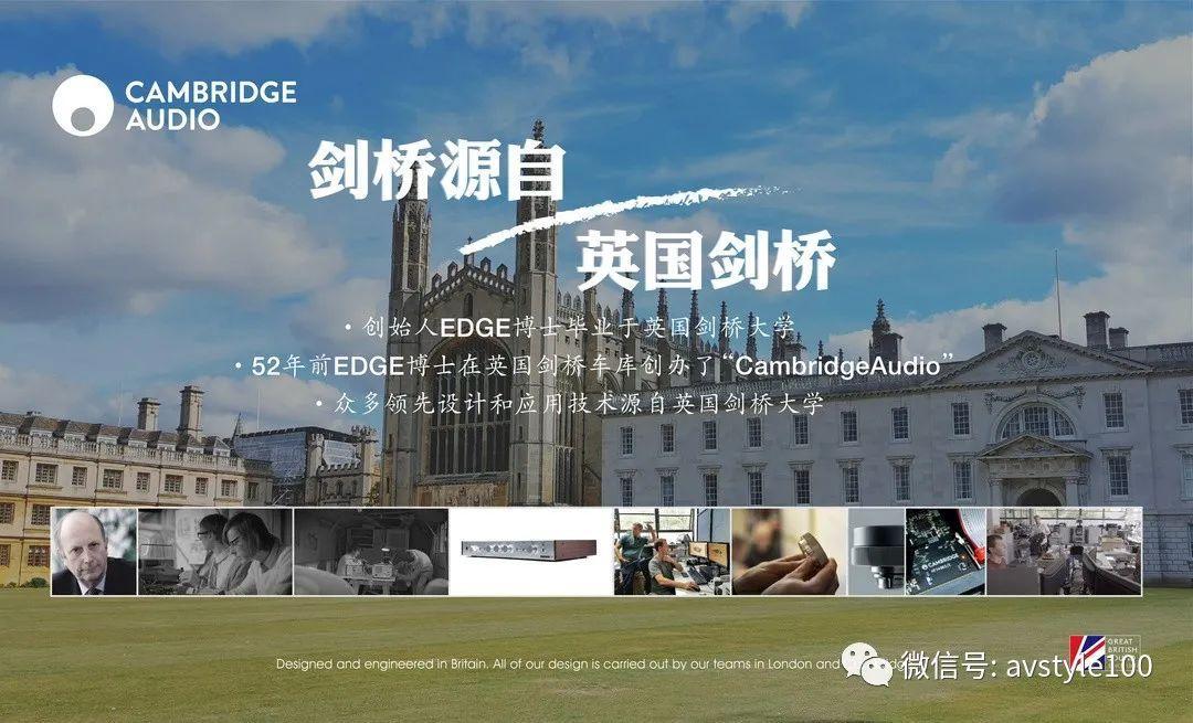Cambridge Audio是英國音響品牌中歷史悠久的廠家,設計以「外簡內精」的獨特創新風格風靡全球,同時產品的設計風格又不失傳統紳士的風度,內在的音樂感受更是讓人嘆為觀止。Cambridge Audio所設計的產品都有一個特點,就是希望產品可以讓普遍消費者能享受到音樂所帶來的樂趣,所有器材都以「無添加、不帶走」原訊號內任何東西作為目標,而研發產品時也會儘力簡化訊號傳輸的路徑,也就是我們經常所說的「最短」路徑,最後更以「先聆聽,再量度」為宗旨。
