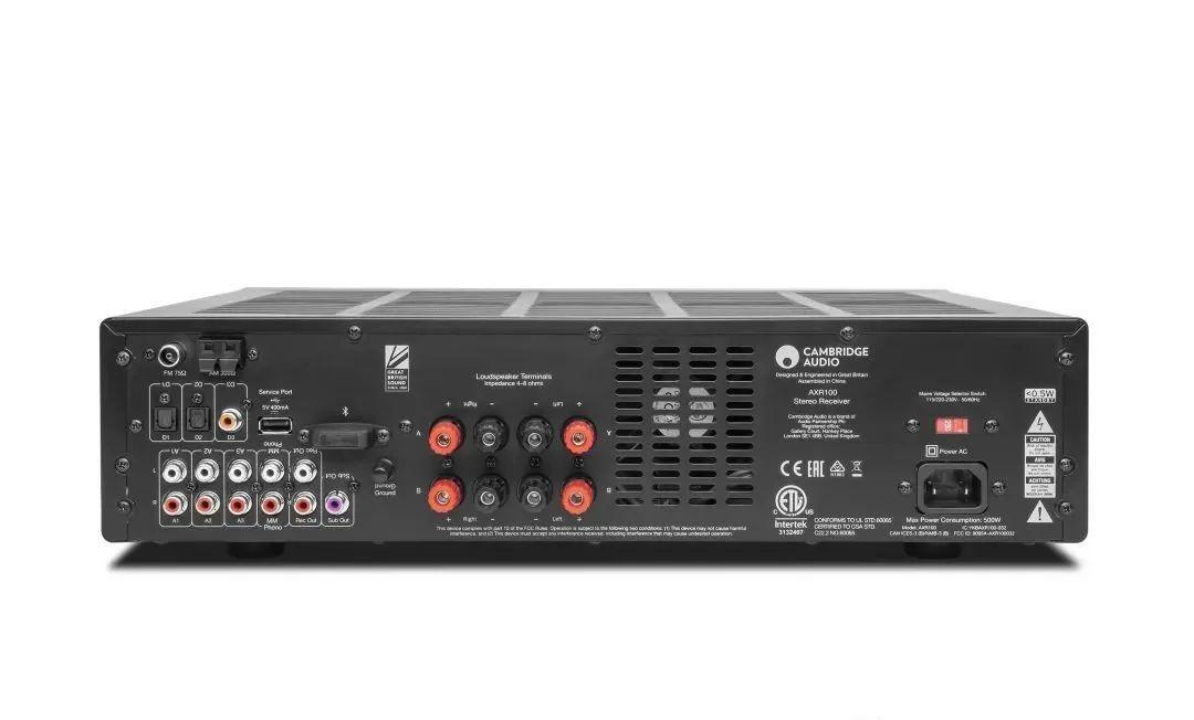 AXR100採用AXR85的模板並加添數碼輸入(兩個光纖和一個同軸),同時將功率輸出增加到100W。搭配一個專用的超低音揚聲器輸出口改善低音效果,方便用戶連接小型客廳影院。AXR100立體聲放大器具有強大的功率和靈活性,是給有要求的音樂愛好者的理想選擇。它能輕易驅動兩個立體聲揚聲器,並且配備非常豐富的輸入接口,包括三組模擬RCA輸入、一組Phono輸入、錄音和低音炮輸出以及3.5mm立體聲輸入和前置的6.3mm耳機輸出。它配有FM/ AM調諧器和內置藍牙接收器,方便無線串流播放。