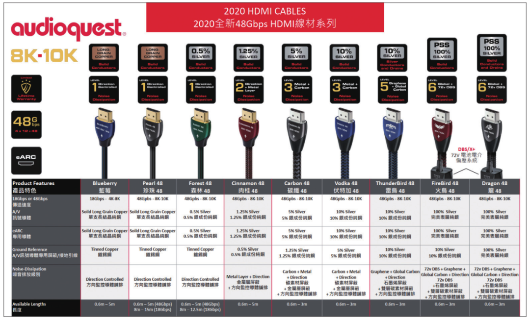 最近AudioQuest便发布了9款全新HDMI线材,分别为:Blueberry(蓝莓)、Pearl48(珍珠48)、Forest48(森林48)、Cinnamon48(肉桂48)、Carbon48(碳纤48)、Vodka48(伏特加48)、ThunderBird48(雷鸟48)以及带72V电池电介偏压系统(DBS)的FireBird48(火鸟48)、Dragon48(龙48)。所有型号将会配备方向监控导体铺排及AudioQuest专利研发的噪音排放技术 (Noise Dissipation),除了入门新成员蓝Blueberry提供18Gbps带宽及对应4K/8K 之外,余下型号全数享有48Gbps带宽,支持8K/10K、8K/60和4K/120视频、HDR (高动态范围) 以及eARC (强化音频回传声道),全面迎合新世代HDMI 2.1家庭影院制式和超高帧率竞技级电玩人士的需求。