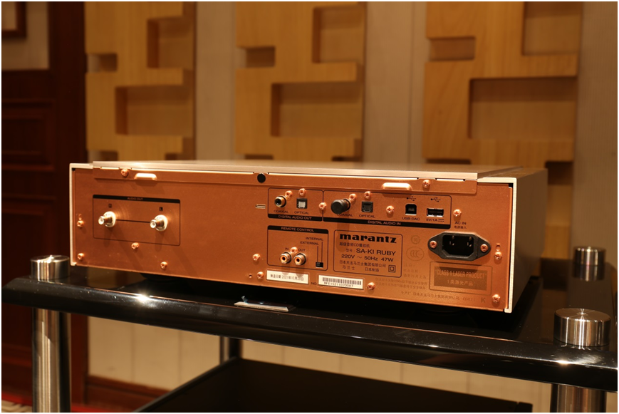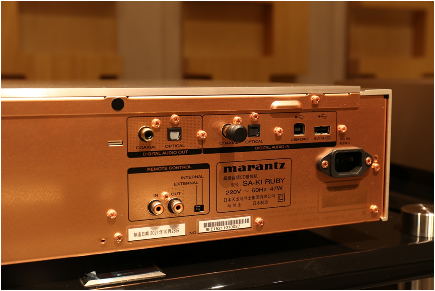 接口方面,Marantz SA-KI Ruby SACD/CD播放機採用了單端線路框架,支持RCA模擬輸出,和數字光纖、數字同軸的輸入和輸出,以及一個異步USB type-A輸入端口。異步USB type-A端口可以播放高達32bit/384kHz的PCM文件,以及DSD 11.2MHz文件;這些端口也均配隔離器,可阻止來自連接源的噪音。