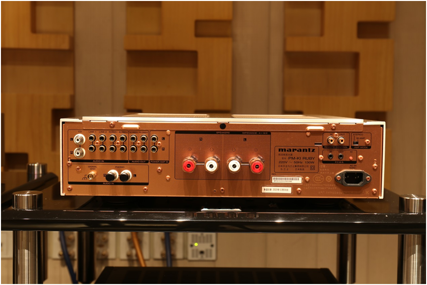 PM-KI Ruby合併機有6個RCA輸入、2個輸出,以及一個6.3毫米耳機輸出。其內部電源採用了分離的兩級電源設計,PM-KI Ruby合併機的前級部分採用模擬電路供電,而後級採用獨立的D類放大電源供給。而且前級具有EQ電路設計的動磁和動圈黑膠唱放,而後級可以為每聲道提供100瓦(8Ω負載)或200瓦(4Ω負載)輸出功率。配合新的線性音量控制、電子音量系統,Marantz PM-KI Ruby合併功放在清晰度、信號回放的純凈度上做的相當完美。
