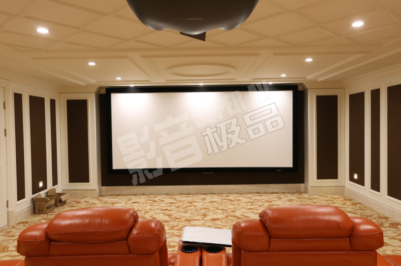 為了達到最佳的影音效果,設計師對整個影音室做了聲學裝修及設計處理,他們嚴格按照美國THX和清華聲學處理的要求,利用專業的聲學測試軟件對該房間的聲學分佈特點做了專業的聲學處理,考慮到影音室房間面積,決定通過專業聲學儀器測試工具對整個影音室進行反覆多次測試,最終結合現場環境特點做出了最優的聲學解決方案。要想讓私人影音室的視聽效果出色,聲學環境設計尤為重要,其中聲學材料如何搭配使用最考驗影音設計師的專業功底。這間影音室聲學材料全部採用隱藏在牆面裝飾材料後面,已達到內里功能強大,外觀簡潔時尚。