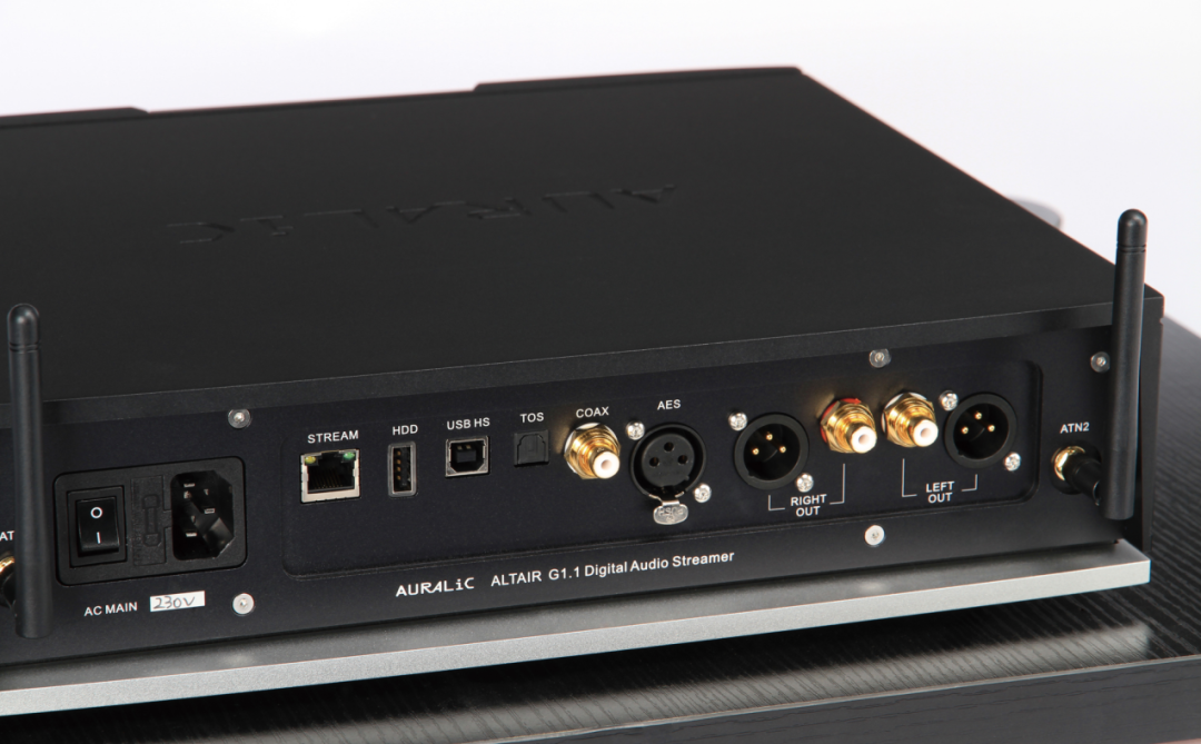 而器材背面接口一直是測評人員對數字音頻播放器所關注的,可以看到升級後的ALTAIR G1.1與G1版本是一致的,依然以數字輸入接口為主,包括外接存儲設備的HDD,USB B型解碼輸入接口(第二代動態USB接口不僅提供對USB數據的異步控制,還可以提高準確性和精確的時鐘恢復,減少了抖動)同軸光纖以及AES/EBU和網絡接口(包含Wi-Fi)。模擬輸出接口包括XLR和RCA,滿足不同系統接入需求。