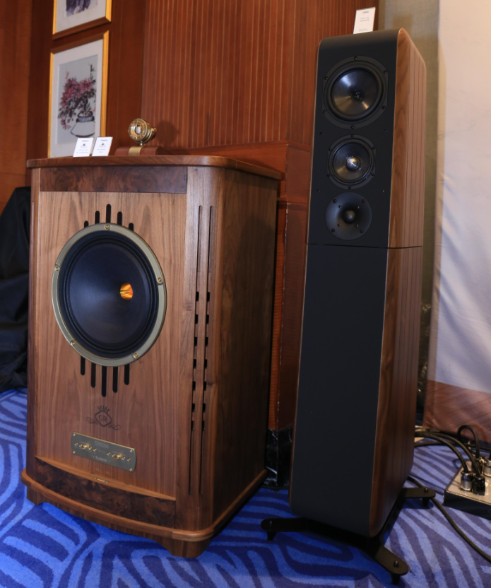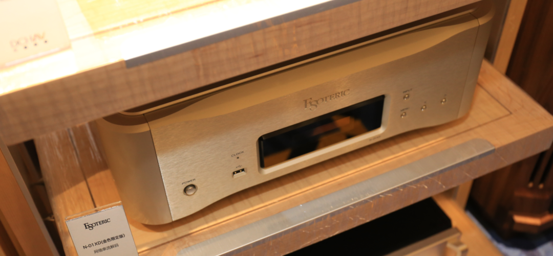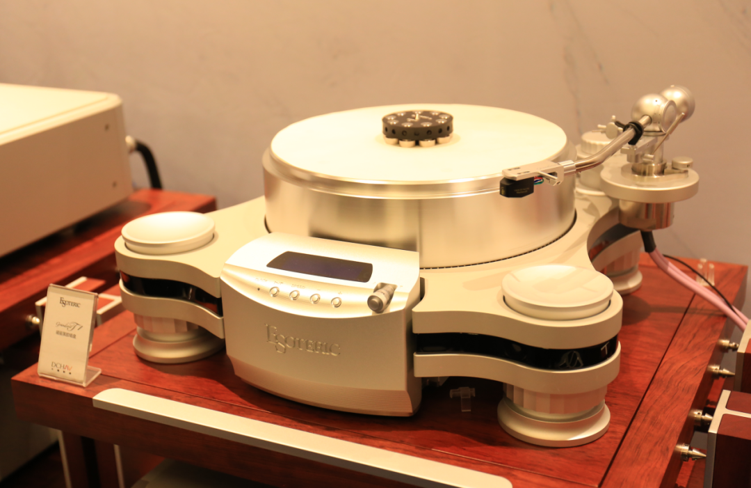 展厅现场,大昌行带来两套音响系统,其中一套以全套Esoteric器材驱动Tannoy Canterbury GR同轴座地式音箱。该系统中的音源选用Esoteric Grandioso T1黑胶唱盘,这是纪念Esoteric成立35周年的新品。当中专利注册的“Esoteric MagneDrive System”具备独特无接触式传动装置,磁性驱动器与盘片之间使用磁力以非接触方式同步旋转,实现盘片能以稳定的旋转速度,安静、丝滑地进行运转。