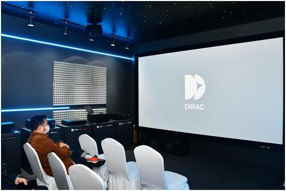音响展现场,Dirac搭建了一间真正的7.3.4多声道沉浸声影院,该影院配置3个独立超低音扬声器,通过DiracLive空间校正算法对影院声学环境进行数字化处理,消除空间对声音产生的物理影响,让声音变得更干净清晰。