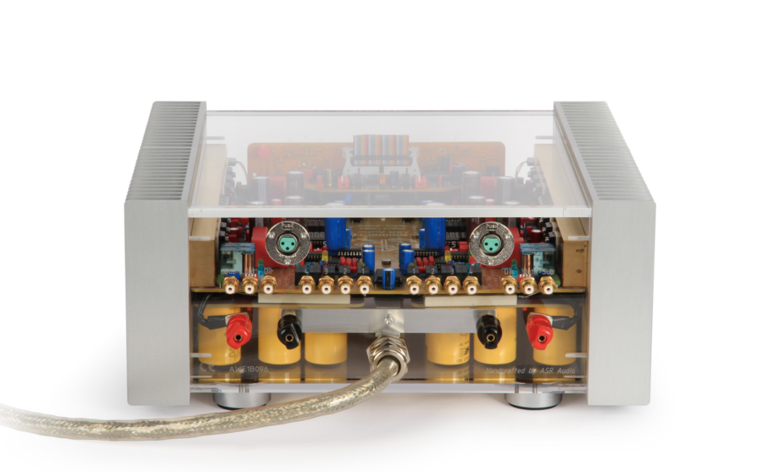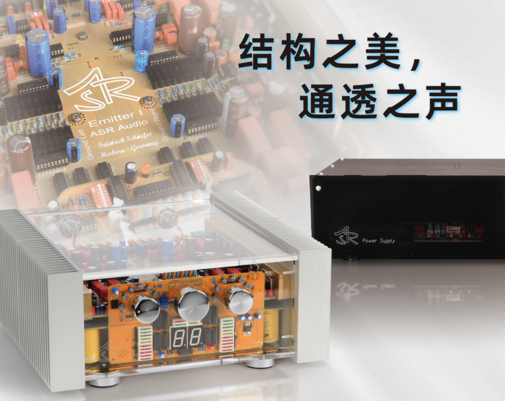 當然,你也會問為什麼不使用常規的金屬材料製作機箱呢?除了亞克力材料諧振頻率比金屬更低之外(不會讓人耳聆聽到敏感頻段的尖銳共振),金屬機箱普遍會存在「磁迴路」,也會反射機內電路的電磁干擾,從而導致聲音產生劣化情況。而採用亞克力材料製作的機箱則可讓這些噪聲穿透,不會對放大器的放大電路產生負面影響。放大線路設計上,ASR採用「被動式前級」與「高增益後級」相結合的設計架構,其着眼於去除前級電路的主動放大電路,達到有效減少信號放大級數與縮短訊號傳輸路徑的目的,進而讓放大器擁有更好的瞬時反應,而這一點與市面大多數合併放大器很不一樣。這種更加直接和更短的訊號傳輸,在聲音的表現上音質將會更加純粹直接、更加通透、瞬態更加出色。