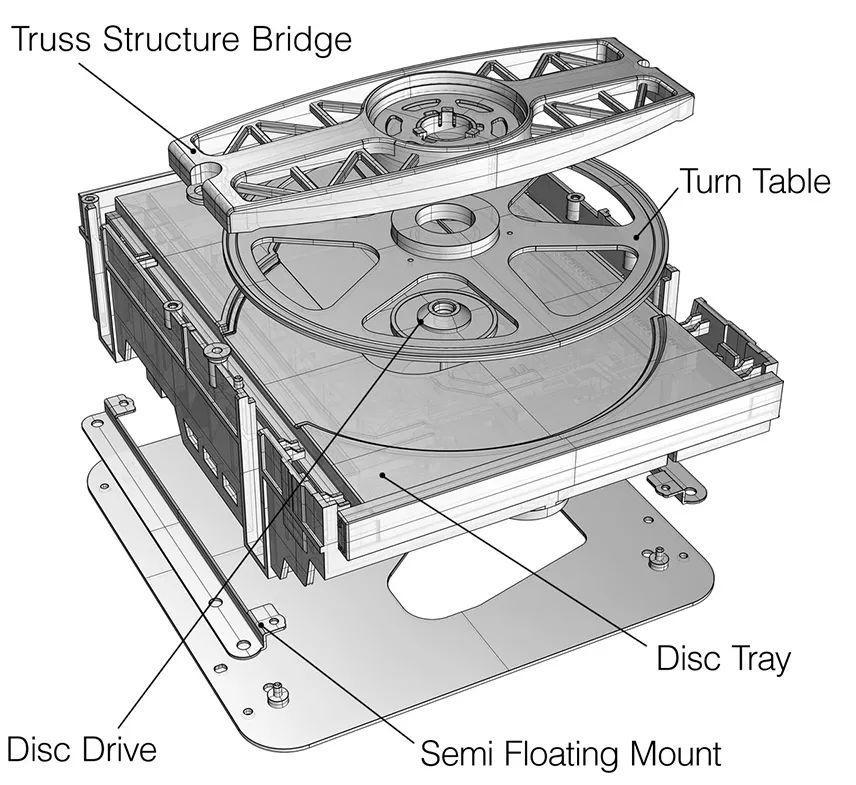 对于支撑转盘的桥梁,TEAC精心挑选了坚固而且不会传递振动的轻质材料,以自然的物理方式快速稳定振动,实现了广宽的声音动态, 与此同时,桥接板位置采用树脂制成的圆环结构,仅固定在一侧,目的是抑制振动从 CD 通过桥接板传到另一侧,整个结构和设计,有效地将不需要的共振减小。