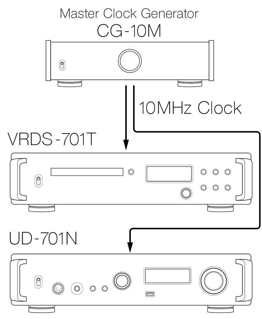 10MHz 时钟输入允许与外部时钟同步,除了在使用 VRDS-701 播放期间提高音频质量外,这还可以使整个系统与时钟进行同步。