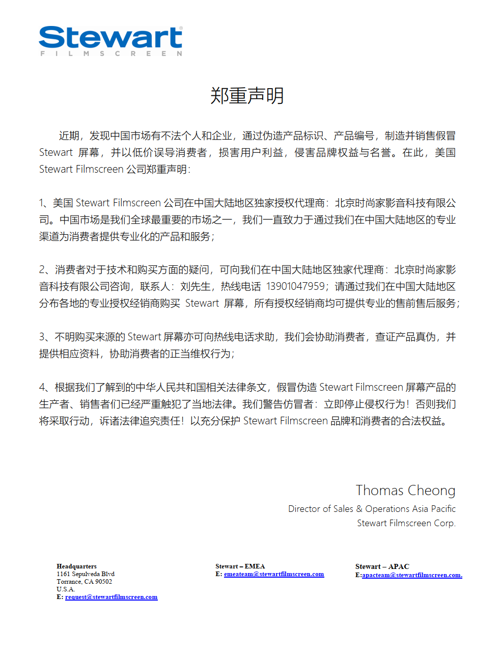 近期,發現中國市場有不法個人和企業,通過偽造產品標識、產品編號,製造並銷售假冒Stewart 屏幕,並以低價誤導消費者,損害用戶利益,侵害品牌權益與名譽。在此,美國Stewart Filmscreen 公司鄭重聲明: