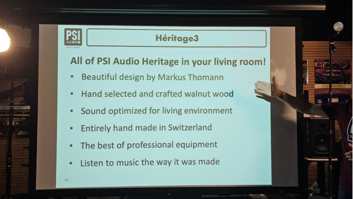 Héritage3是PSI Audio在45年经验累积下达到顶峰的杰作,其是针对家用环境而开发的有源座地式音箱,外观有Markus Thomann先生设计,拥有充满视觉温暖的胡桃木木皮饰面。虽然Héritage3是专门为家庭使用而设计开发的,但PSI Audio工程师能够借鉴从开发三分频录音室监听音箱A25-M中获得的专业知识,为挑剔的音乐爱好者提供专业水平的声音。Héritage3凭借无DSP、完全模拟的电路与具有45度角的外壳设计相结合,以减少二次辐射,并在整个频谱范围内实现1dB以内的平坦频率响应等特点,一经推出获得民用市场的高度关注。