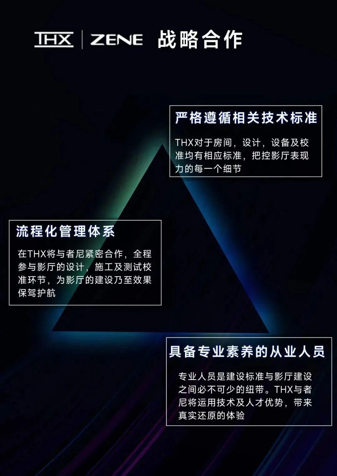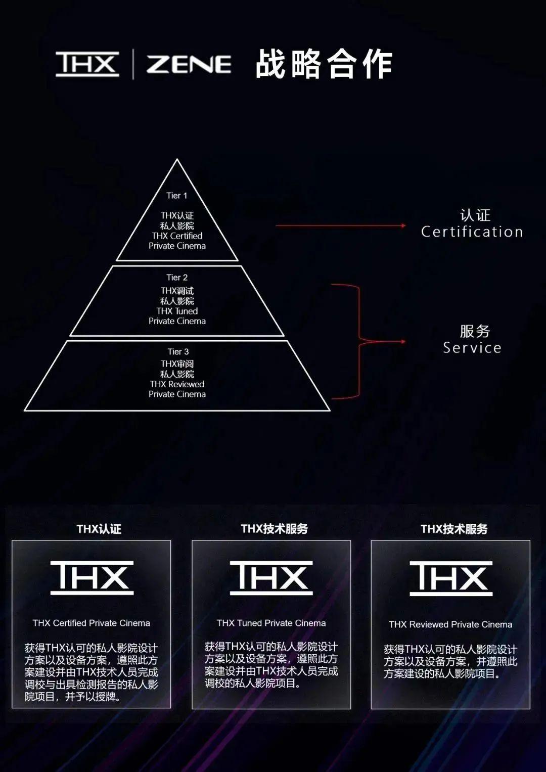 THX是由《星球大战》导演George Lucas乔治卢卡斯于1983年创立,成立至今已有35年,从好莱坞的混音室到商业电影院,再到私人影院,THX一直致力于忠实还原电影创作者的意图,带来更高还原度的影音体验。THX私人影院认证标准是家庭影院领域唯一的、完善的、国际公认的私人影院系统表现力、房间设计与声学环境标准,THX拥有完整知识产权,及超过40年的相关检测方法和设计经验。可以说,THX认证一直是业界公认的影院领域的质量保证。ZENE者尼智能影音,作为中国私人影院及全宅智能定制安装行业先行者,一直秉持以专业技术为核心、不断提升客户影音体验的服务理念,使自身始终领跑国内影音智能定制安装行业第一梯队。此次者尼有幸成为THX在国内首家私人影院项目的核心服务商,并可根据用户实际需求,为私人影院项目提供相应认证与技术服务,在追求品质的同时,为合作伙伴及影音爱好者提供更为灵活的选择。