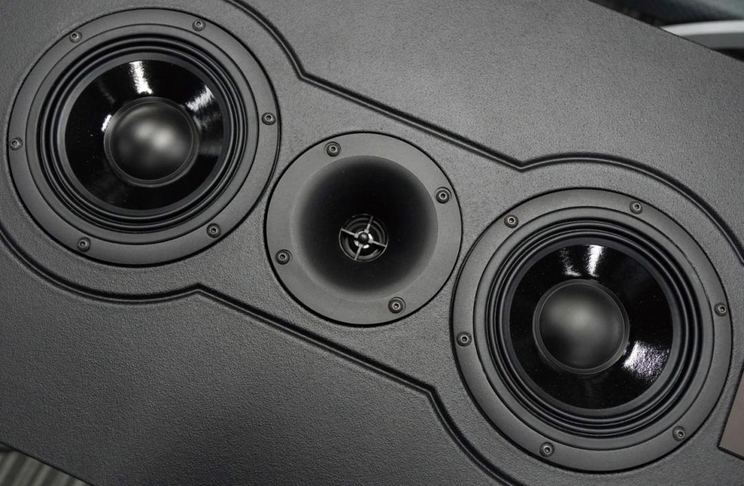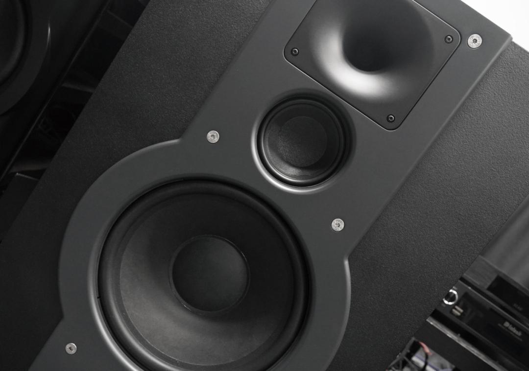别看这套音箱身形高大,其实厚度都控制得很好,很适合嵌入式、贴墙使用,大型音箱其实也可以做到不占太多空间(AUREA更大尺寸产品也可以),同时拥有足够的声箱体积。AUREA箱体单元比例的垂直线与水平线之间完全符合1比0.618的黄金比例,扩散角120度自由发声,声音可以均匀落200平方米空间,满足大空间极致家庭影院需求。AUREA音箱箱体的线条有一份来自商业院线产品的设计味道,这种其实是防刮蹭的喷漆设计,实际摸上去会感觉相当细腻,一点也不粗糙,流露着一种大气的质感。