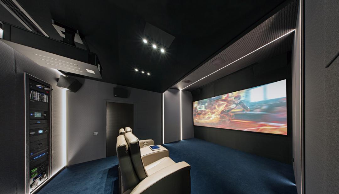 鉴于整套影院用到的音箱由AUREA组建而成,不妨简单称之为AUREA影院系统。作为主音箱的AUREA 17,采用三分频设计,不仅覆盖频率范围广,而且自身的三频衔接,以及和低音炮的衔接都非常流畅,每一个频段清晰有力,该听到的细节也听得清清楚楚,从而塑造了强悍的前方声场。AUREA17这种“大块头”最好的选择当然是隐藏在透声幕后面,这样就能够把它所有的能量都能拳拳到肉“打在”观影者身上。另外,个头小巧的AUREA IW5+5,它的背箱厚度仅有90mm,高度和一般的定制安装音箱相差无几。内嵌式锥形号角结构令它的灵敏度达到93dB,极易驱动。双5.5英寸中低音单元在经过散热技术的升级改造后,承受117dB的声压输出也毫无难度。精巧强悍的特性让它能够被委以重任,负责重播所有来自环绕声道和天空声道的信息。