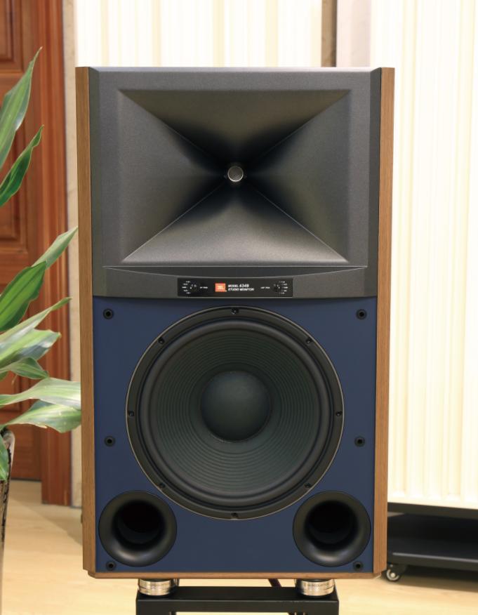 这对JBL 4349书架式监听音箱属于JBL 4000系列的复古监听音箱,具有典型的蓝色面板,胡桃木实木贴皮的箱体饰面,质感典雅精良。此外,4349另有黑色胡桃木贴皮版本,看起来更有录音室监听味。