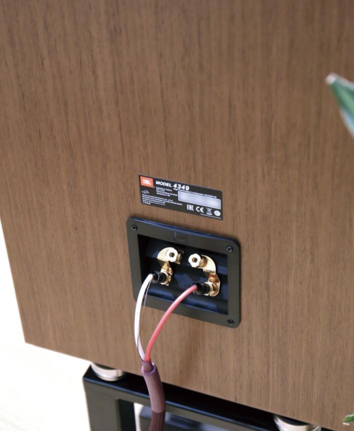 JBL 4349采用了典型的号角两音路系统,搭载一副专利的HDI(High-Definition Imagine)号角开口,形状十分特殊,具有低失真特性,号角本体则采用Sonoglass复合材料制作,具有降低谐振的效果。高音单元并非传统的半球型设计,而是JBL的1.5英寸D2415K双振膜压缩驱动器,其技术源自于JBL用在专业领域的D2压缩驱动器,具有双环形振膜和双音圈,振膜独特的V形几何形状可减低盆分裂并降低失真,并提供更高输出和动态。再配合一只12英寸纸盆低音单元,搭配特殊的双弹波设计,可确保在最大输出之下并维持低失真表现。在音箱的正面,还有两个向前发散的低音反射孔,用户可以利用这样的设计,将JBL 4349尽量贴墙放置,腾出更大的聆听空间。
