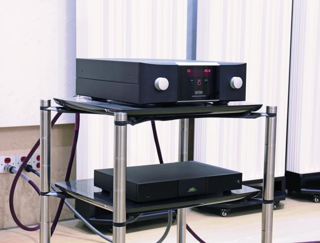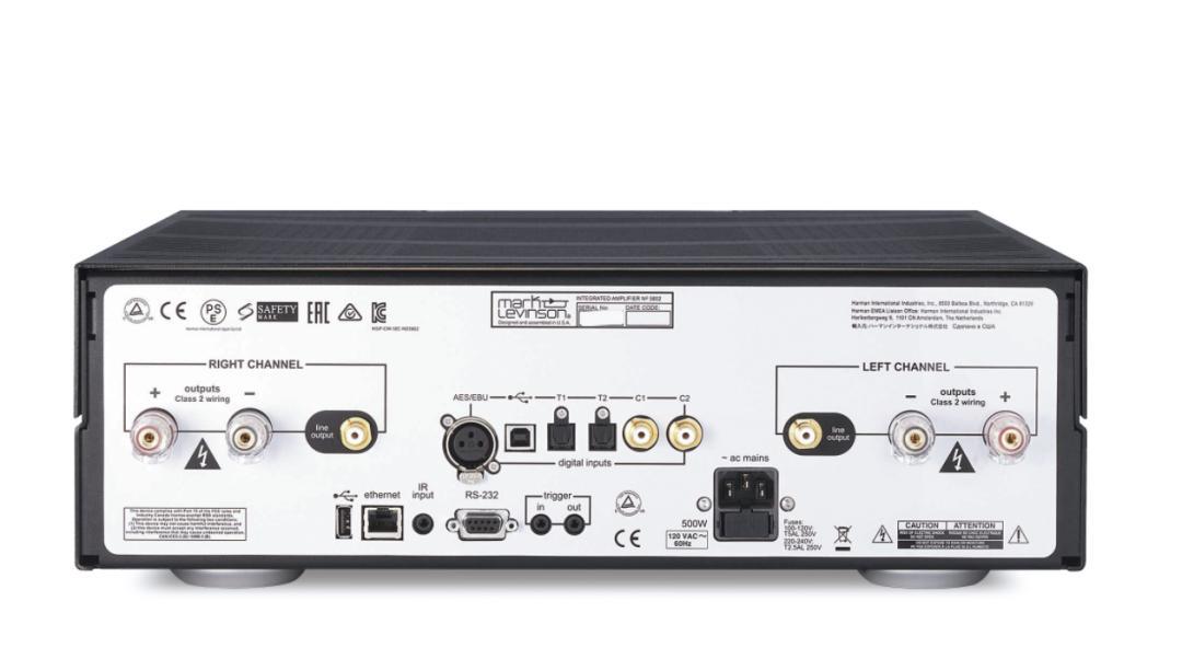 再看看驱动这对JBL 4349的MARK LEVINSON No.5802,属于MARK LEVINSON 5000系列的合并放大器。这款纯数字接口的MARK LEVINSON No.5802配备了自家的PrecisionLink II DAC,具备精密的时基误差消除电路,搭载ESS Sabre 32芯片,提供AES/EBU、USB 2.0、Coaxial S/PDIF与Optical S/PDIF输入,最高可支持32bit/384kHz PCM与DSD 11.2解码,并能播放MQA格式。电压与电流转换采全平衡电路,并全数以离散组件建构,而非简单的OP放大。