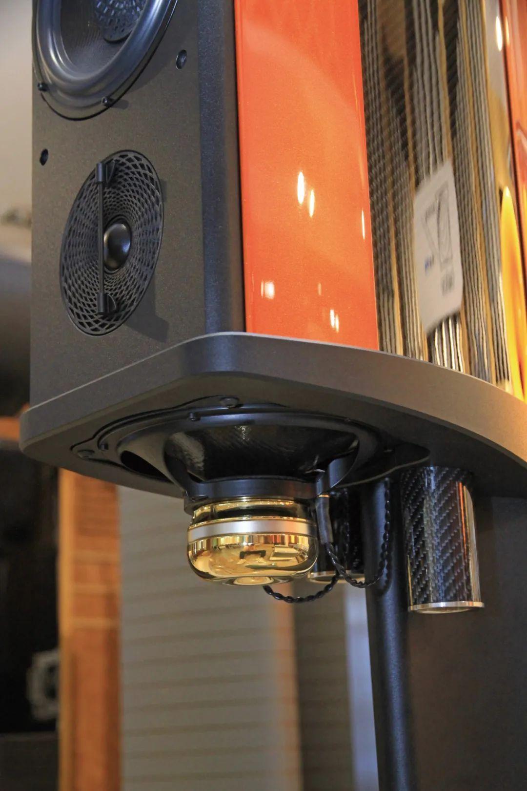 值得注意的是,這隻中音單元位於獨立腔體之中。該腔體採用碳納米超級纖維複合物料製成,腔體強度比同體積的鋼材強度高近百倍,硬度與金剛石相當,同時卻擁有良好的柔韌性,具有良好的強度、彈性、抗疲勞性,可以有效地提升中頻段的純凈度和整體表現能力。