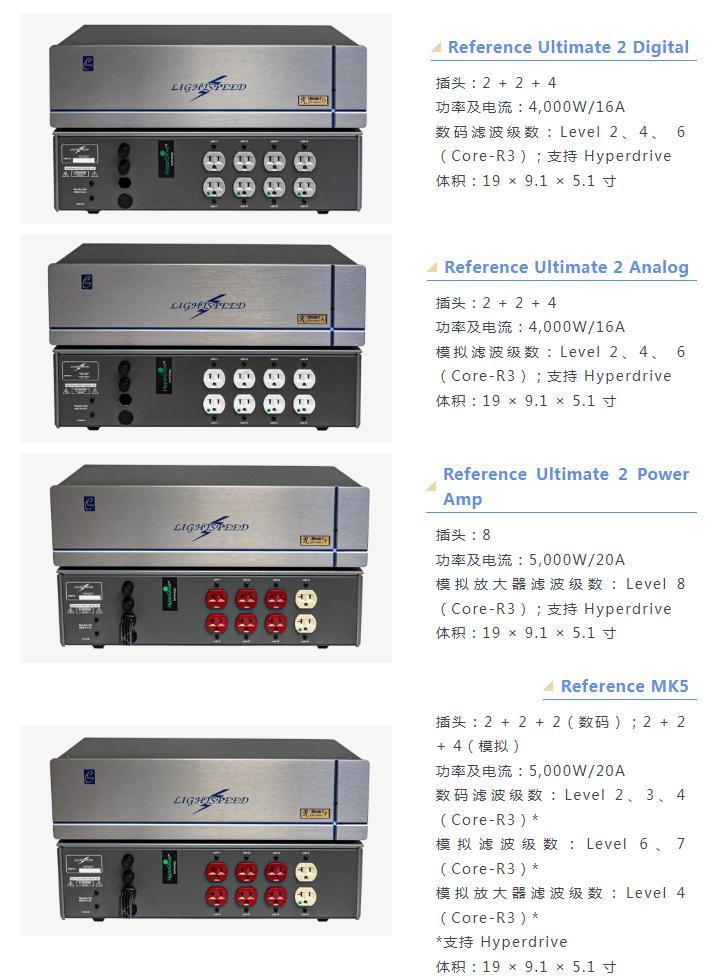 Reference 系列属于 Lightspeed 产品线当中的旗舰系列,共有 Reference Ultimate 2 Digital、Reference Ultimate 2 Analog、Reference Ultimate 2 Power Amp 以及 Reference MK5 的 4 个型号。前三者分别是对应数码器材(Digital)、仿真器材(Analog)、功率放大器(Power Amp)而设的电源处理器,而 Reference MK5 则是多功能机款,同时提供了三种类型器材的接驳。除了采用最高等级的 Core-R3 滤芯之外,也配备了高级型号使用的 Hyperdrive 技术,可以进一步降低电源噪讯,改善音场、动态、细节等的特性。而 Power Amp 以及 Reference MK5 可以应付高达 5,000W/20A 的电流,另外两款也支持 4,000W/16A,「大食」的高功耗系统也可以应付自如。