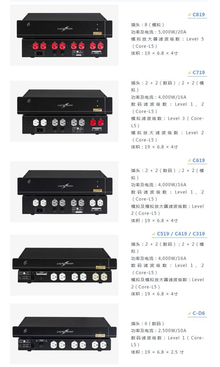 Lightspeed 由美国电学工程师和资深音响发烧友 Michael Chang 创立至今已经有 30 年,全线产品都是美国制造,质量相当有保证。当初就是由于不满意市场上的电源处理产品,于是就自行费尽心思研发,所以 Lightspeed 一直专注于电源处理器材。虽然一系列产品都是采用美式插头,不过由于美式插头也是资深发烧友常用的配置,贪其不设 fuse(保险丝),不似英式插头一定会多一重阻隔,而有需要的用家也可以另外订制英式插头,所以依然有相当多本地的拥趸。