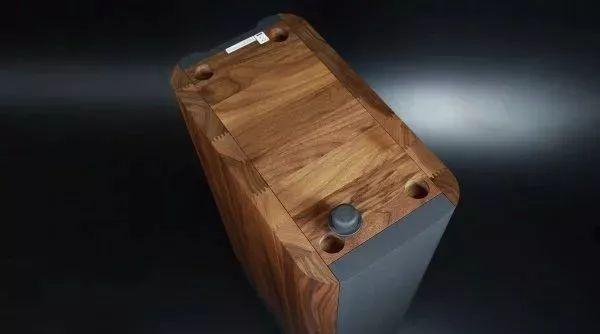 上下半截喇叭的固定方式很有意思,原厂先在书架喇叭底部四角、低音柱顶部四角挖好圆孔,先把4个粗壮的橡胶圆柱体,像插销一样一半插进低音柱圆孔内,另一半对准书架喇叭底部,直接叠上去就行了,完全没有用上任何一颗螺丝就能将箱体衔接起来,而且两者之间保留大约1~2mm的空隙,如此一来两个箱体就没有大面积接触,被免低音柱的箱体谐振影响到上方中高频细节。