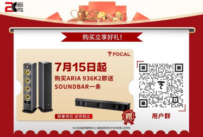 爱威影音的二十周年大献礼活动第一轮内容为:从2023年7月15日开始,凡是购买劲浪FOCAL Aira 936K2限量版落地音箱的消费者,只要加入专属“用户群”,晒出使用环境照(5-8张)和产品序列号,经工作人员核实无误,即可免费获得价值6990元的劲浪FOCAL DIMENSION SOUNDBAR声霸一条。