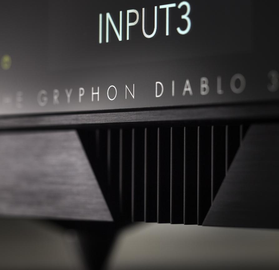 全新Gryphon Diablo 333合并放大器承袭技惊四座Commander指挥官分体式前级的DNA,出自贵丰始创人Flemming E. Rasmussen先生手笔的它,造型线条无疑来得更为优雅讲究,经过巧妙挖空加工的黑色航天级铝面板,配备三角造型立体玻璃视窗,内藏4.3英寸TFT 电容触碰彩色显示屏幕,提供左右声道平衡及讯源输入微调资料。机身两旁设有造型跟旗舰Apex顶峰纯A类后级相同的高效率散热器,大幅提升强放环节的散热效能。实践机械落地理论 Mechanical Grounding 的全新避震钉脚,旨在将谐震、共鸣及拾音器效应快速导离,并能阻隔谐振回授的出现机会。接驳上,Diablo 333提供2组平衡XLR及单端RCA输入,另加录音器材专用回路Tape In / Out及超低音专用输出Sub-Out 各1组,各组输入电平不但可作微调,防止输出音压出现大幅偏差,还提供AV Bypass功能。