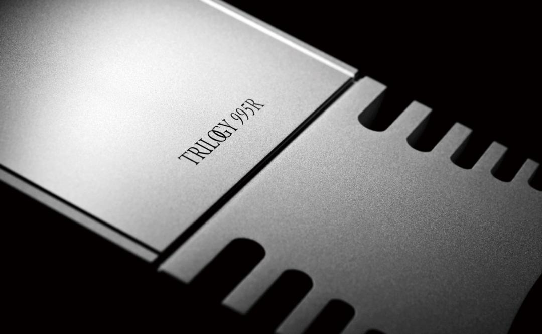 再來看看995R單聲道後級放大器,這是Trilogy品牌歷經四年研究而來的成果。與915R一樣,995R也是通體亞光磨砂航天級鋁材,稍稍內凹、橫截面呈反弓形的前面板上,電源開關按鈕也是下沉在倒水滴狀的凹陷之中,同樣顯得優雅而富有層次感。與大多數後級放大器不同,995R的散熱器鰭片位於機體前部、面板的左右兩側。從頂部看下去,散熱器鰭片的間隔深度由前至後不斷加大,呈現出一種有韻律的機械美感。除此之外,頂板上面的品牌型號字樣和三根鏤空線條也進一步增添了神秘感。