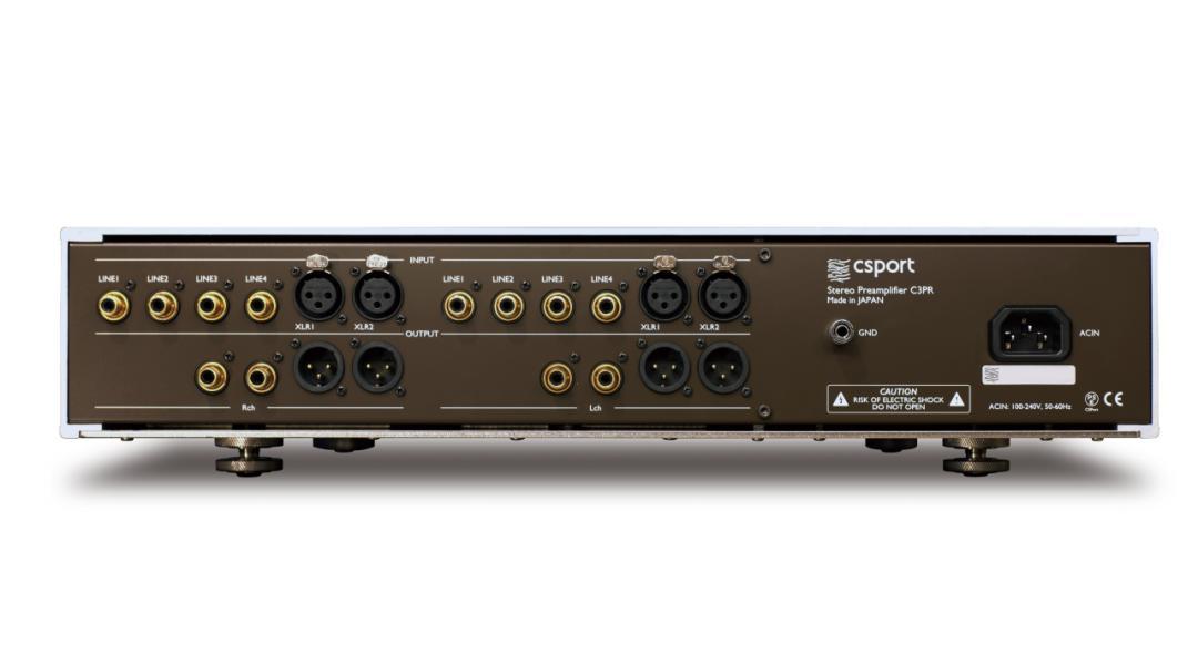 C3PR前面板的按鍵非常簡單清晰,包括電源開關、Input輸入信道切換、音量控制、COMP(低音調節)以及靜音/Balance(左右聲道平衡)。而背面接口方面,C3PR非常豐富,也不愧為純模擬前級之傑作。輸入接口一共有6組,4組非平衡RCA和2組平衡XLR,輸出接口包括4組,2組非平衡RCA和2組平衡XLR。另外配有一個接地端子,如果用戶有器材接地需求(例如黑膠唱盤),可以通過它來接地。CSPort專為C3PR底部增加了4個精緻的可調可鎖緊的腳釘,令器材更容易調節平穩,同時起到調聲的效果。