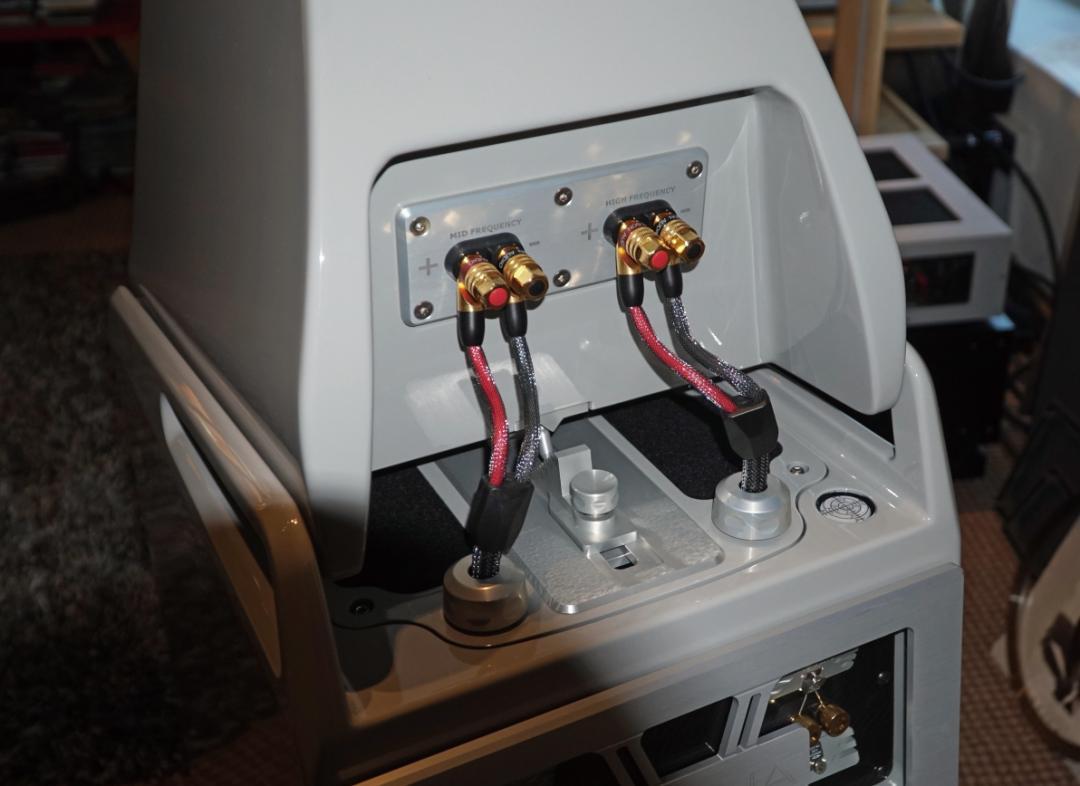 中高音箱体与低音箱体之间采用了全新设计的Alignment Block列阵阶梯系统,以达至更精细的“时域”准确性。在低音箱体顶部还设置了一个高准确性的气泡水平仪,令箱体的水平调校更加方便。低音箱体上方的两侧翼板,空气导流开口进一步加大,从而减少顶部的高中音和低音箱体之间不必要声波压力。两个箱体之间的线材连接,均采用Wilson Audio Spade叉型插头,跟Chronosonic XVX、Alexx V和Alexia V上的一致。另外,针对箱体外部连接线,Wilson Audio专门设计了线材夹,与V-Cable完美配合使用,并且无论中高音箱体如何调整,连接线都不会被拉扯,同时确保低音音箱拥有绝佳的密封性。