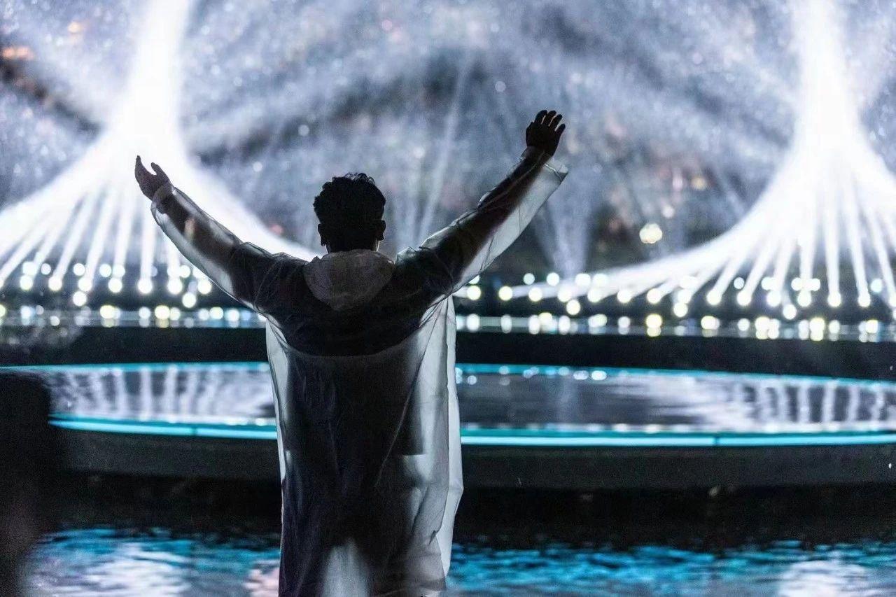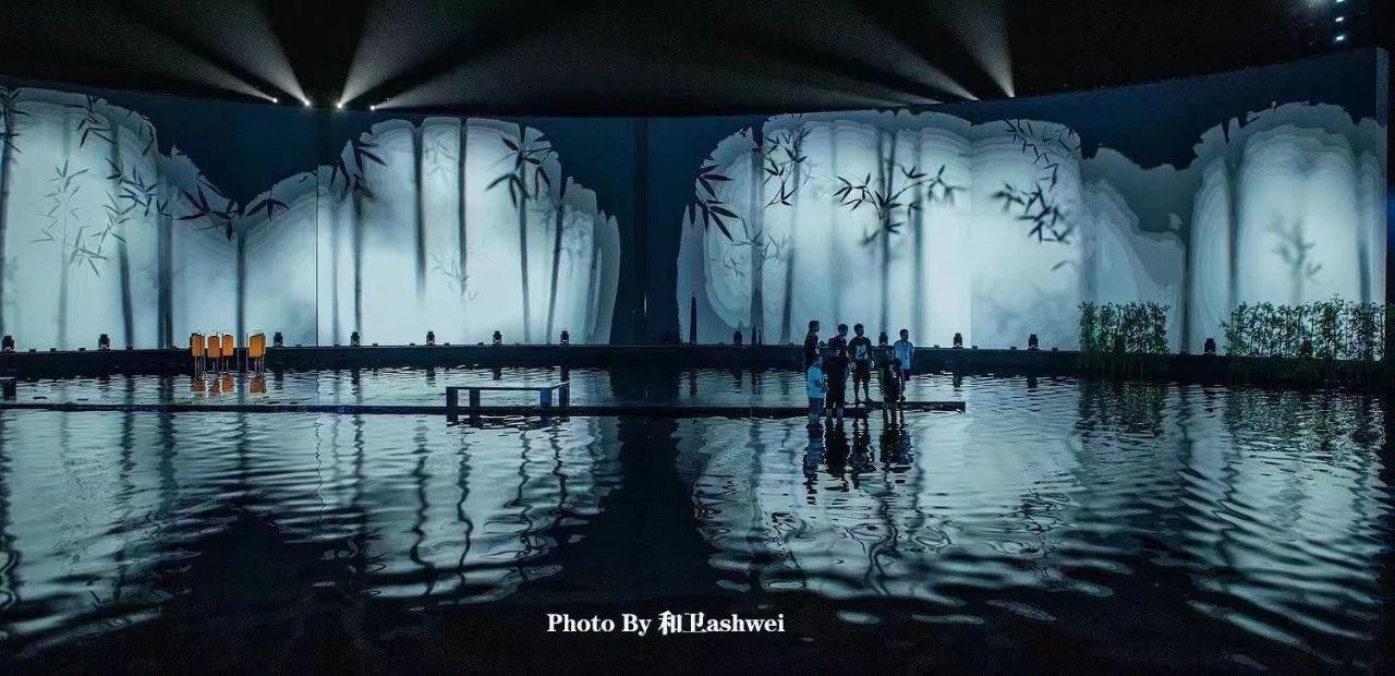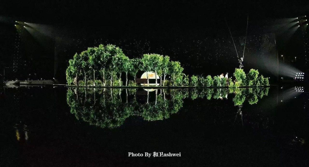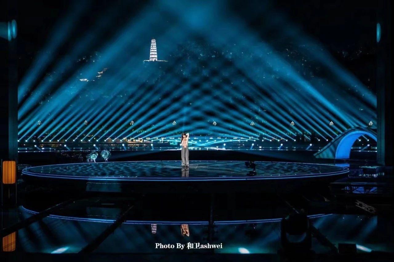 今年總台中秋晚會採取通透結構的主舞台設計,位於主舞台中央的視頻「鏡框」,配合周邊環繞的可動屏幕,以及環繞式布光和鏤空結構的燈架布置,將三江交匯處沿岸的美景最大程度地融入節目當中。