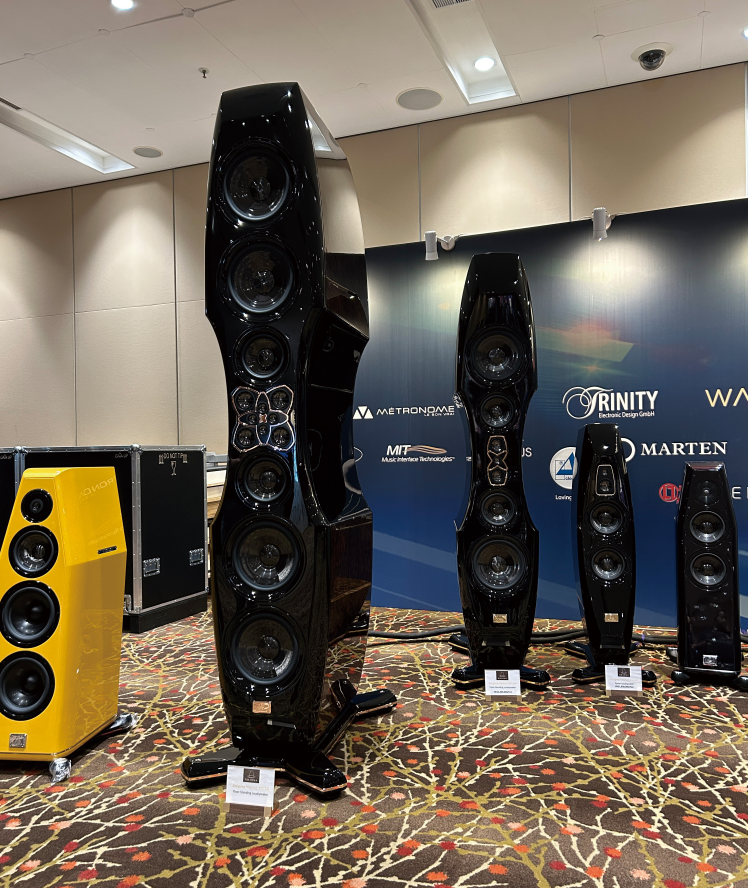 来自荷兰的Kharma是音响爱好者所梦寐的,其一身奢华贵气的外观以及不惜成本的用料,都早已盛名于圈子和业界。在展会现场,我是奔着Telos 8800去的同时,殊不知竖立在旁边的竟然是Kharma的旗舰座地式音箱Enigma Veyron 1D。Goldmund和Kharma这两个贵气十足的组合搭配重播音乐,笔者当然不能错过。