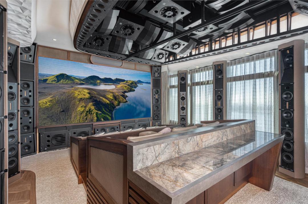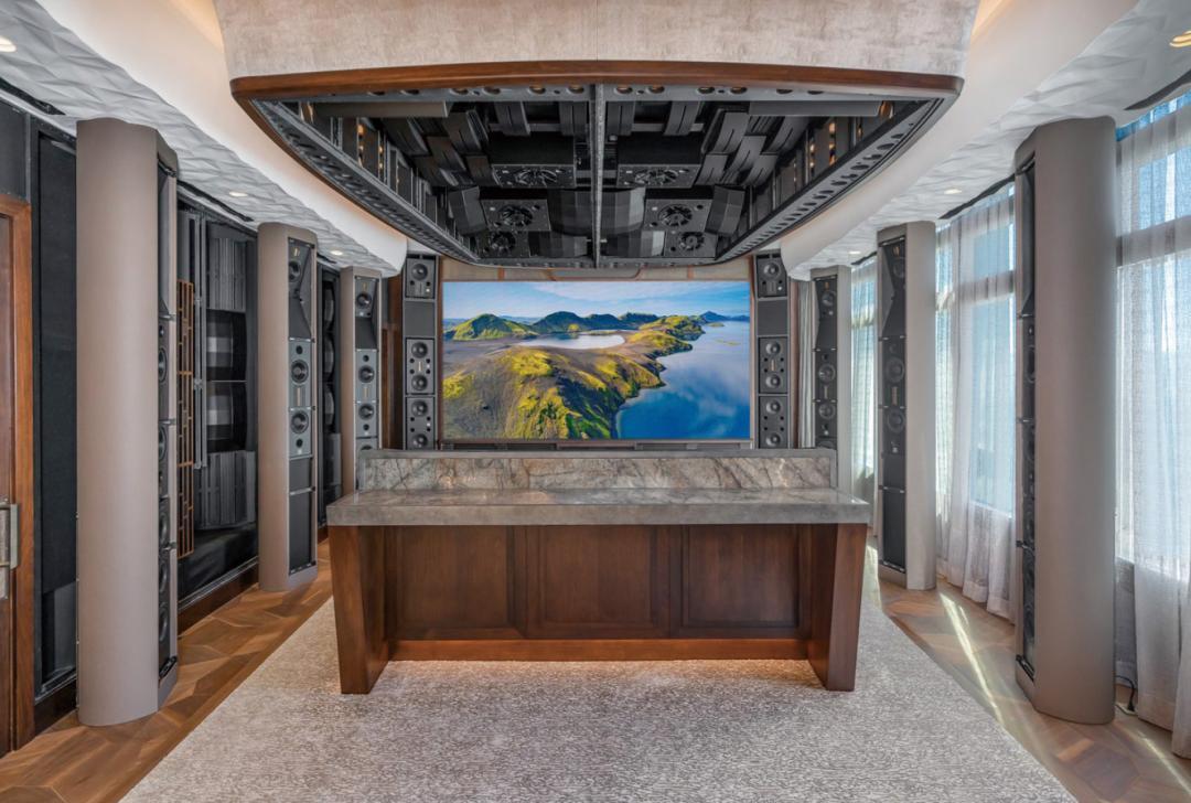Solfar项目入围CEDIA 2022年度最佳家庭影院III级决赛,由当今极具创意和远见的家庭影院设计师Peter CINERAMAX构思和实现,该项目的技术集成商为Wallscreen Skylounges LLC。该案例位于海滨顶层公寓中的先进沉浸式视听室,为家庭影院设计树立了全新的标准。整个系统音频部分主要采用QUESTED(罗杰之声)的定制音箱,代表了之前与欧洲顶级建筑师和设计师合作开发的顶峰,带来了视听技术的突破性创新。技术集成商Wallscreen Skylounges在背投和曲面实体屏幕方面拥有超过35年的经验,可巧妙应对视频墙的声学和人体工程学挑战,这次首次在住宅中使用透视窗声学效果。