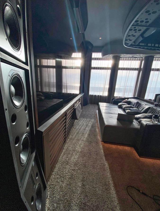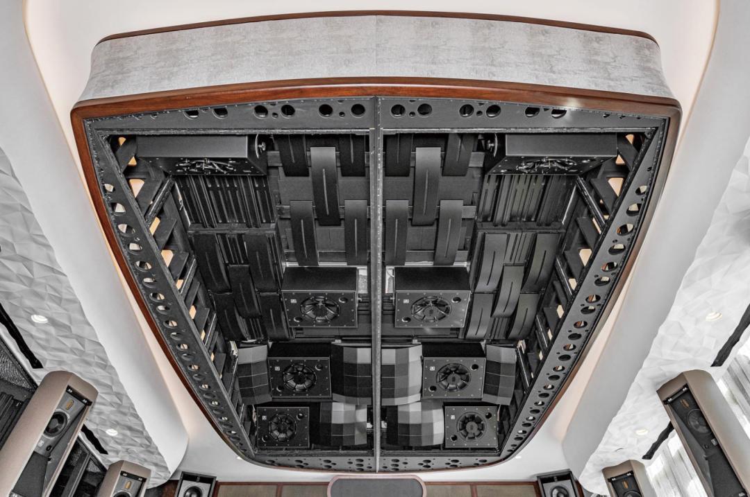 皮革包裹的扩散器柱除了ATMOS 床层包含28.2通道DTS-X pro外环高度层外,第1柱和第3柱还配备了ME Geithain的定制心形低音炮,这是唯一在公寓中使用的低音炮多通道定向震荡,将能量集中在6个主座位上,而不是相邻座位上。您的躯干就像我们的DNA在现实生活中所期望的那样,从各个侧面受到敲击,而不像其他剧院那样将低音全部集中到前面。8个精工设计制作的铝框金属柱提供整个空间80%的扩散,同时容纳上、中、下三层垂直放置的音箱。第2排和第4排金属柱包含了地面声道和Dts-x Pro/Auro环绕声上层高声道,第1排和第3排金属柱则另外增加了同轴心形顶楼定向环绕声低音炮。